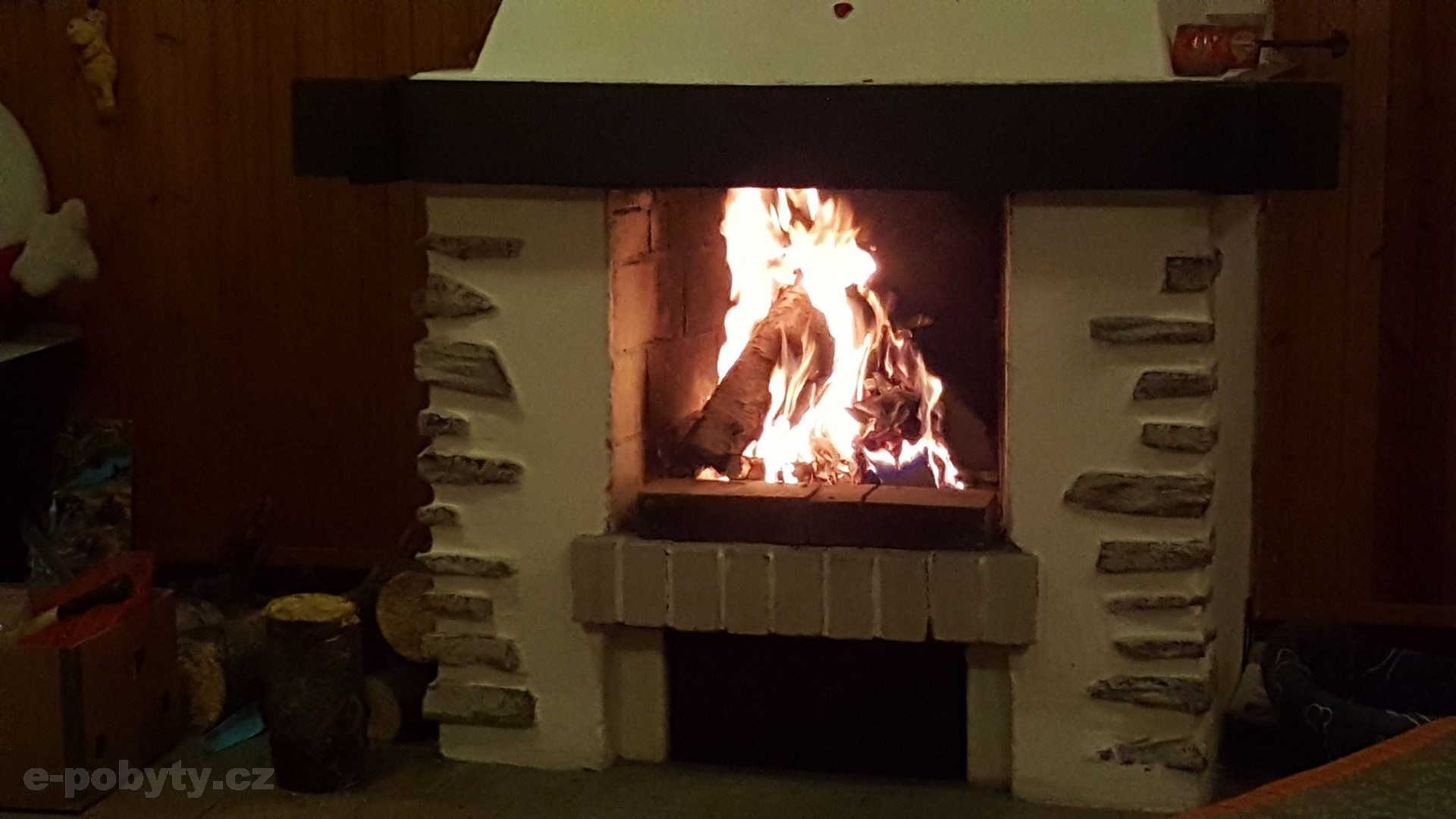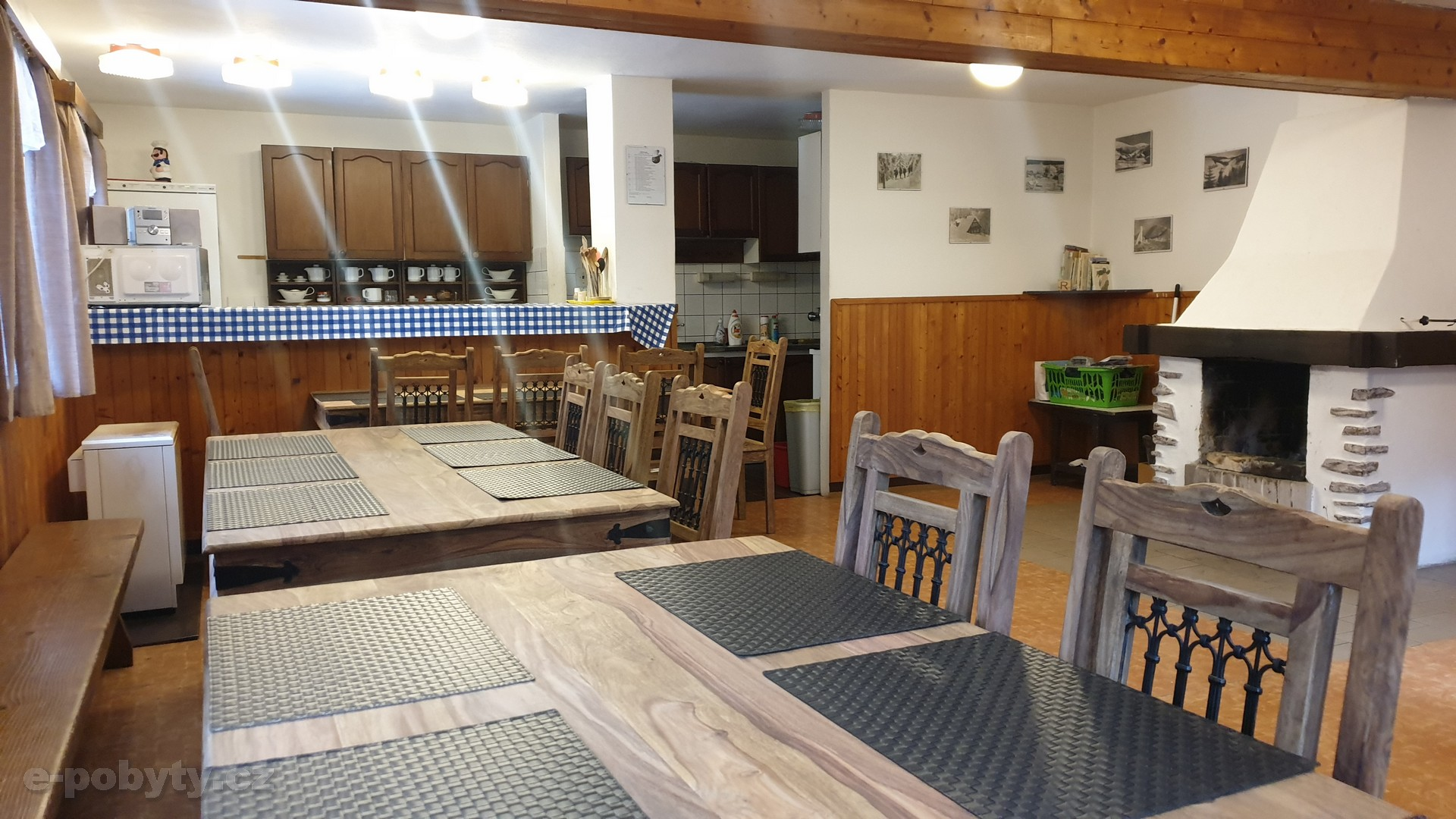 Vytápění: akumulační kamna, ve společenské místnosti je krb.